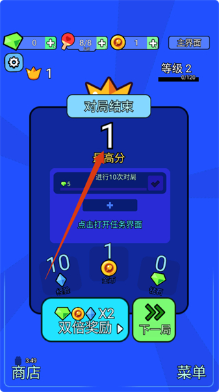 4、对局结束后查看最高分和奖励,点击【下一局】继续比赛,积累经验和金币,提升等级。