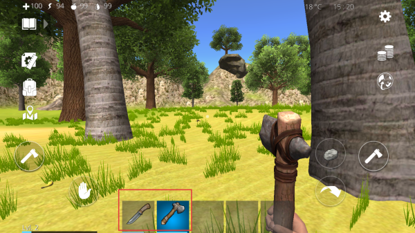 4、使用石斧和刀具在场景中探索,收集资源,拓展生存空间,提升发展潜力。