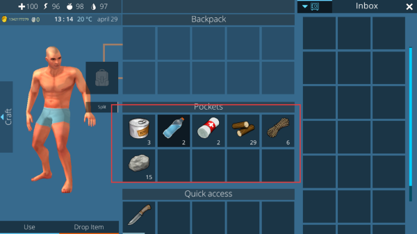 1、整理背包资源,利用罐头、水、木材等,为生存和工具制作奠定基础。