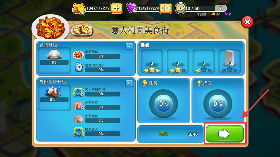 1、进入【意大利面美食街】界面后,确认【任务】-【成就】进度,点击绿色按钮开始当前关卡的挑战。