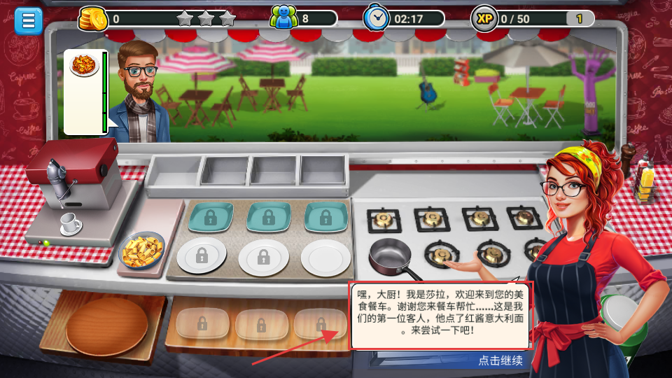 2、跟随【莎拉】的引导熟悉餐车厨房布局,查看第一位【顾客】的【订单需求】准备对应食材。