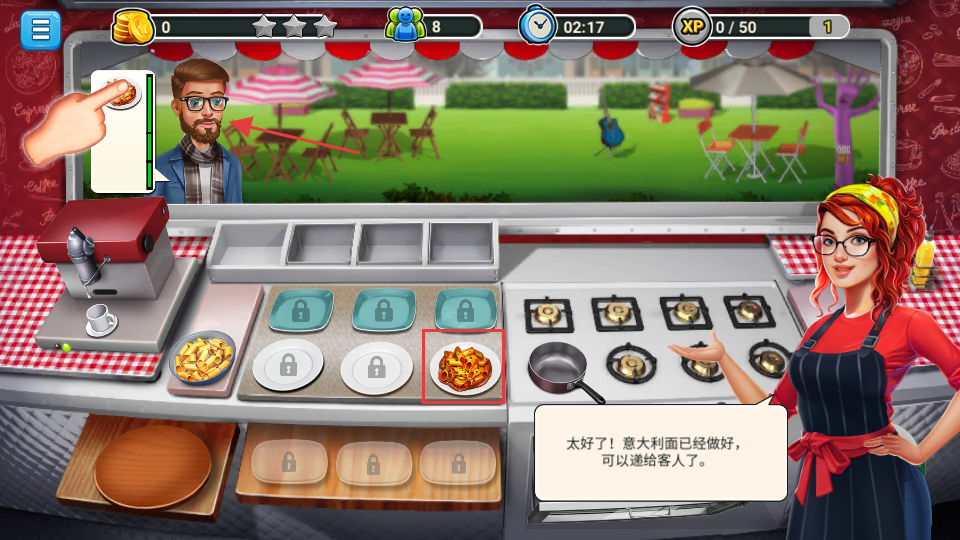 4、把做好的【意大利面】盘子递给对应的顾客,完成订单获取对应的奖励和经验值。