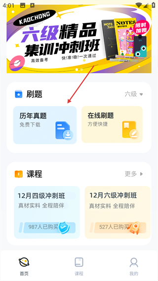 1、进入考虫首页,点击【刷题】板块下的【历年真题】选项。