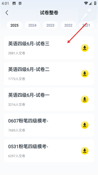 2、在试卷整卷页面,选定想要的真题,点击右侧下载按钮。
