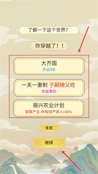 1、开局慎重思考选择天赋能力出身政策制度,所有选项直接决定后续家族发展。