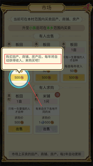 3、进入【市场】界面,购买【田产】【商铺】【房产】,每年自动获得收入积累资产。