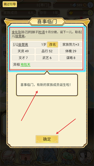 4、面对【喜事临门】,查看新生儿【金楚离】属性,制定培育计划提升家族势力。