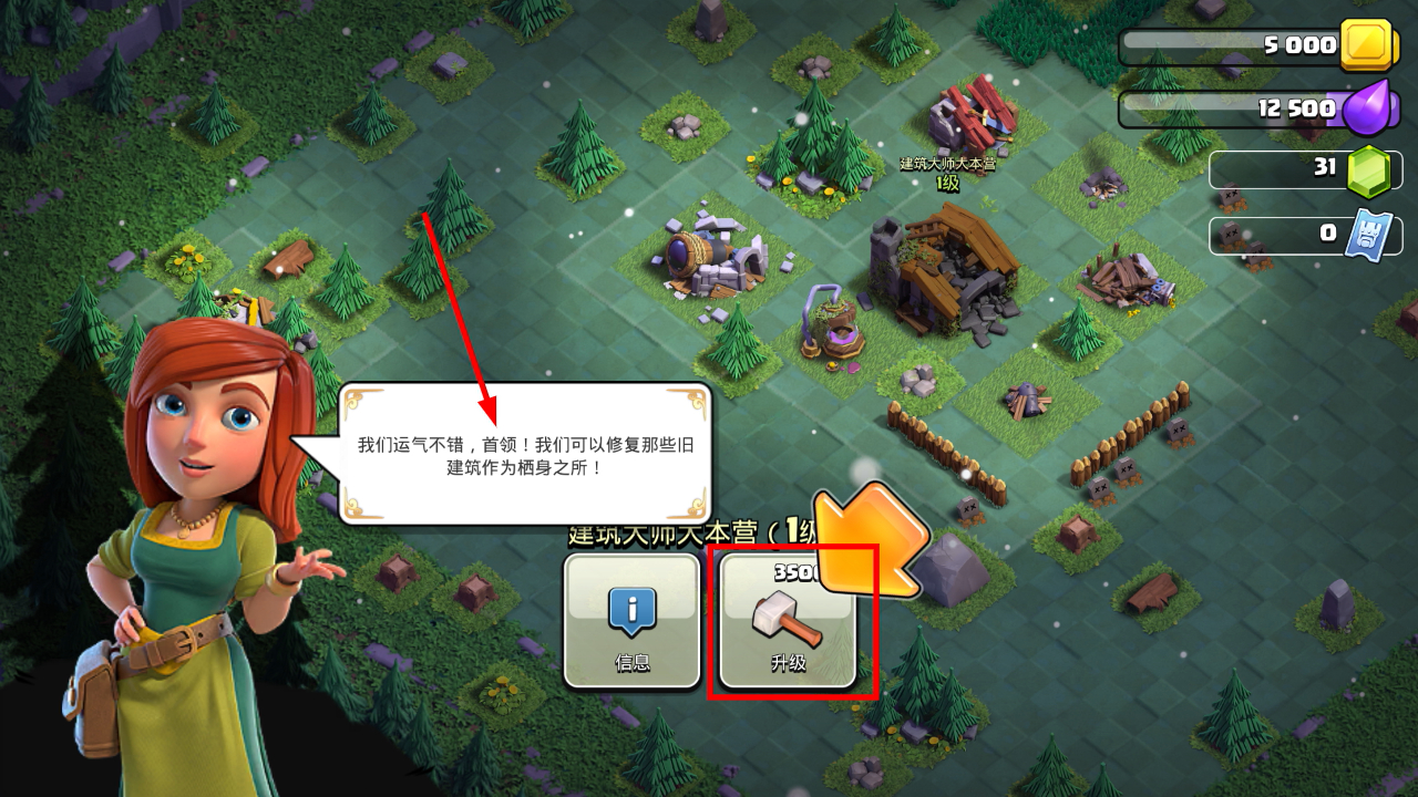4、找到【建筑大师大本营】,点击【升级】按钮修复建筑,将其作为临时栖身点。