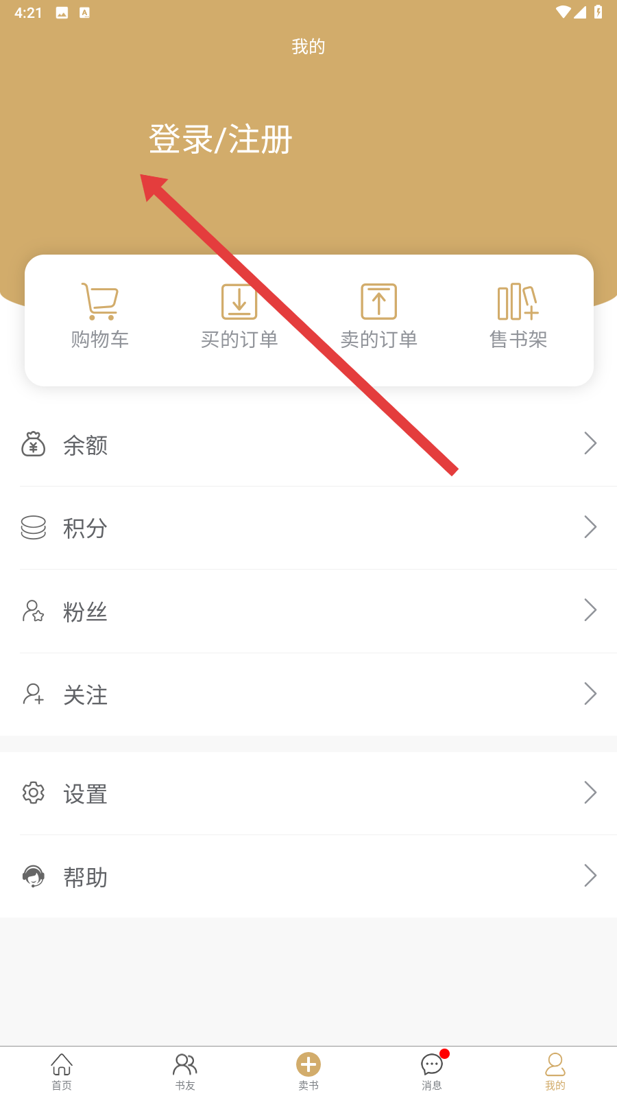 1、进入旧书街【我的】页面,点击【登录/注册】,开启账号注册的第一步哦。
