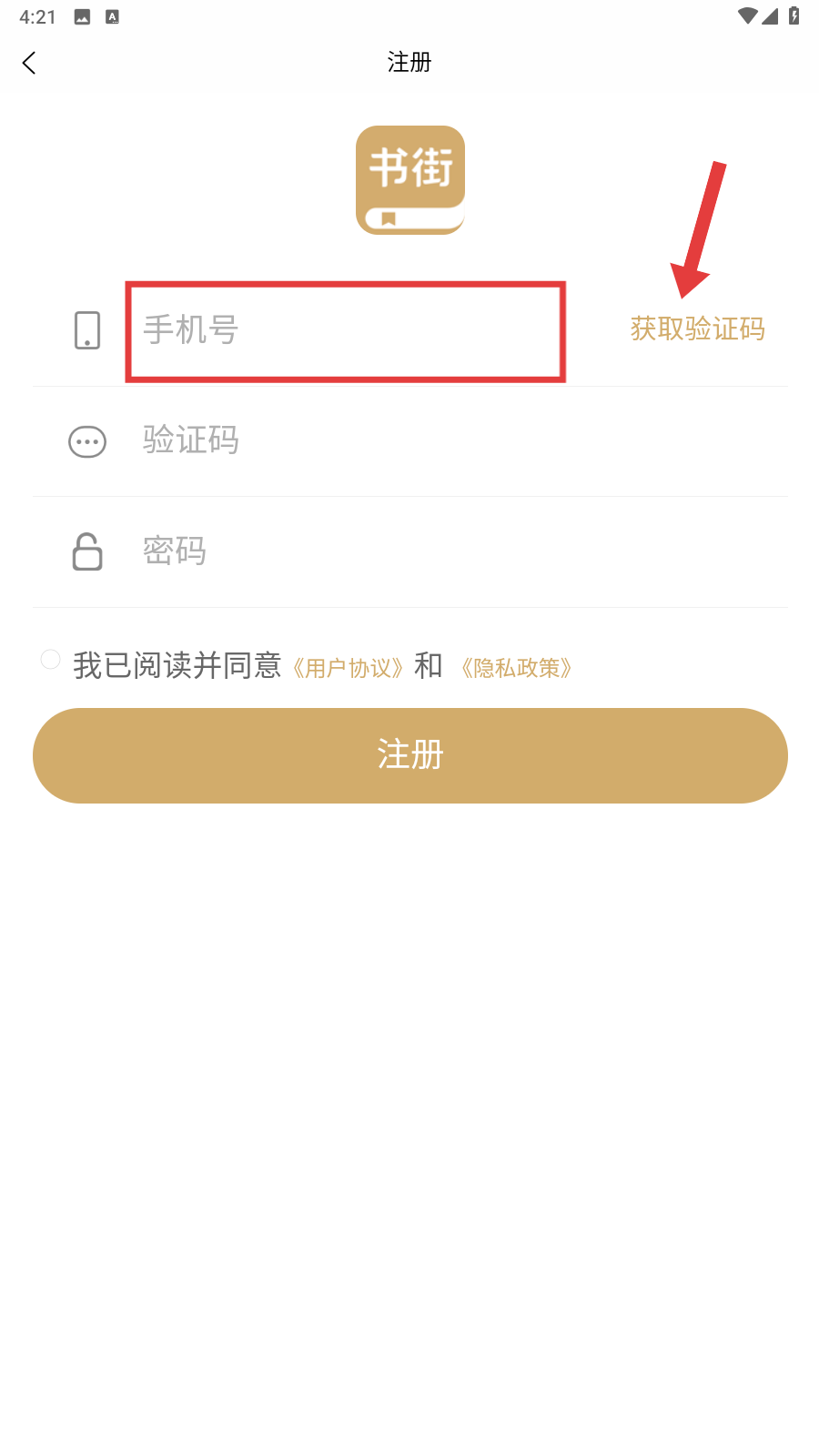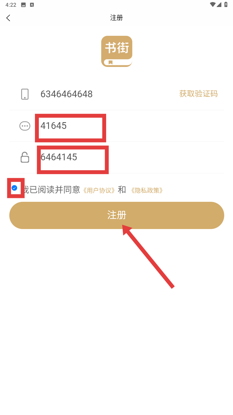 4、填入【验证码】和【密码】,勾选协议后点击【注册】,即可完成旧书街账号注册啦。