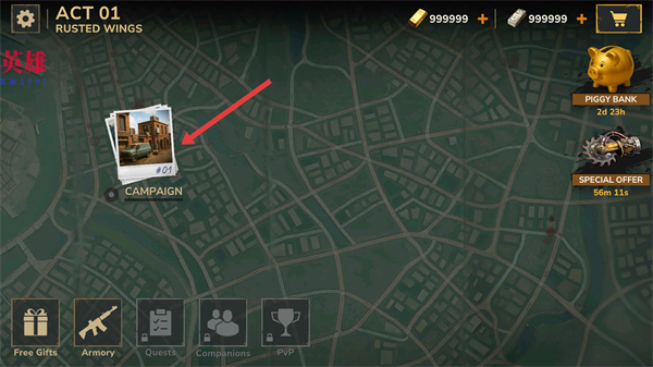 1、在地图界面点击红色箭头指向的战役图标,进入【ACT-01-RUSTEDWINGS】的战役关卡。
