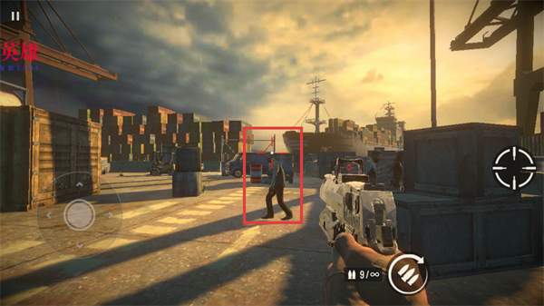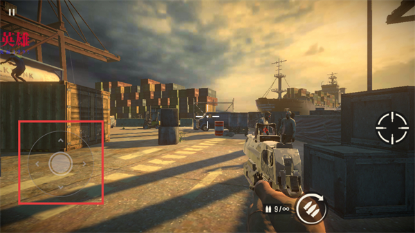 2、战斗中通过左侧红色框内的虚拟摇杆操控角色移动,在港口场景中探索并寻找僵尸。