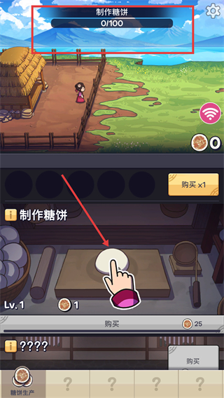1、需完成糖饼制作任务(如制作100个糖饼),通过点击操作进行糖饼的制作,逐步推进任务进度。