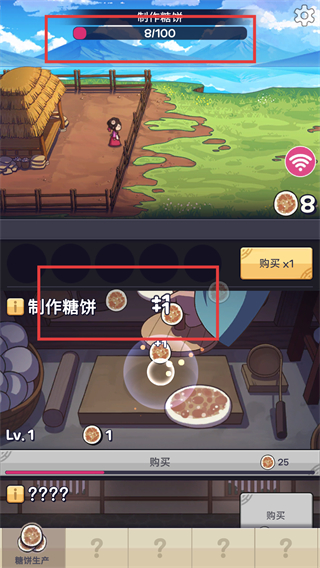2、制作糖饼过程中,关注任务进度条的变化(如8/100的进度显示),确保糖饼制作的持续进行。
