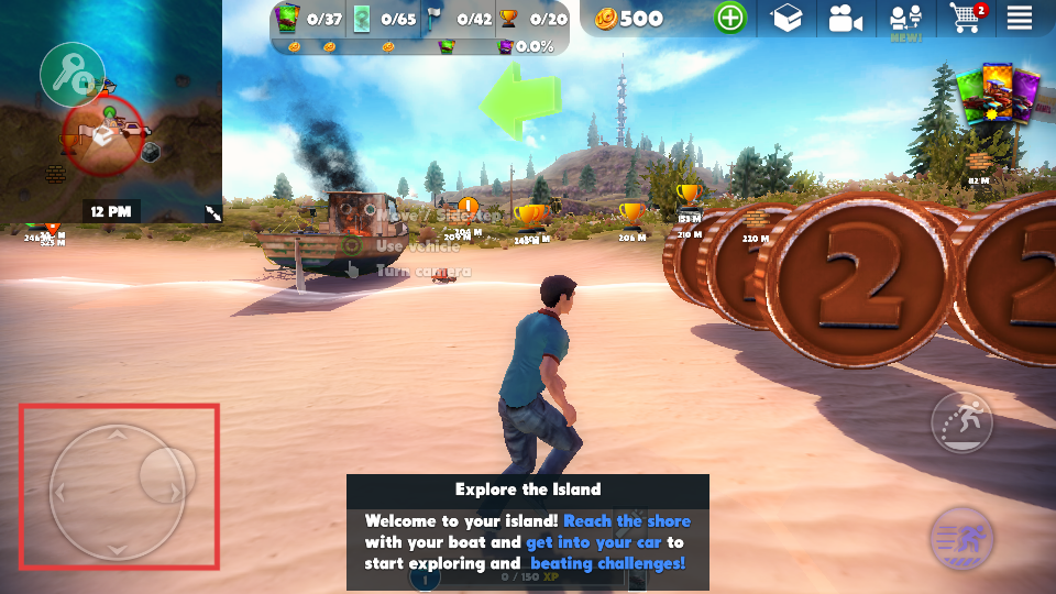 3、使用虚拟摇杆操作角色移动,在沙滩上收集物品,推进岛屿探索。