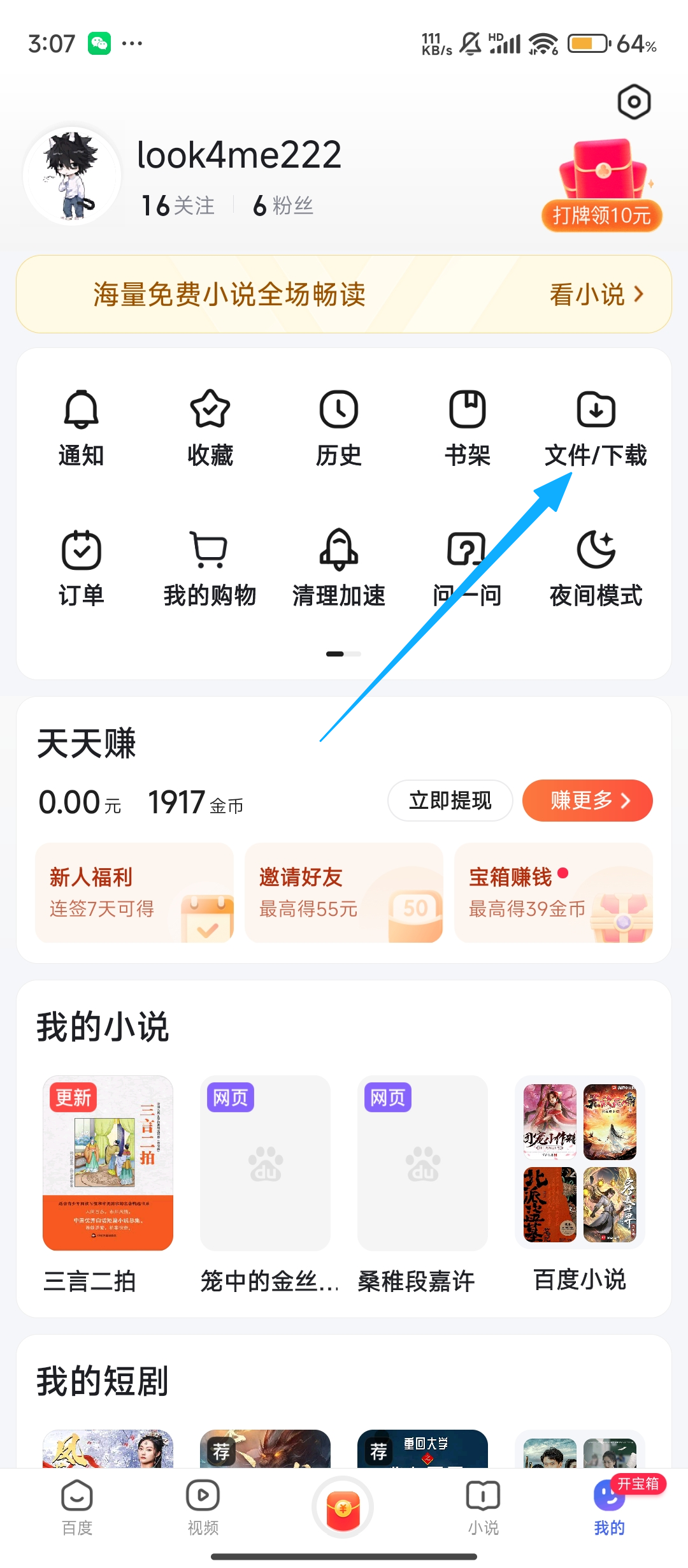 1、在百度浏览器【我的页面】中,点击【文件或下载】选项,进入文件管理界面哦。
