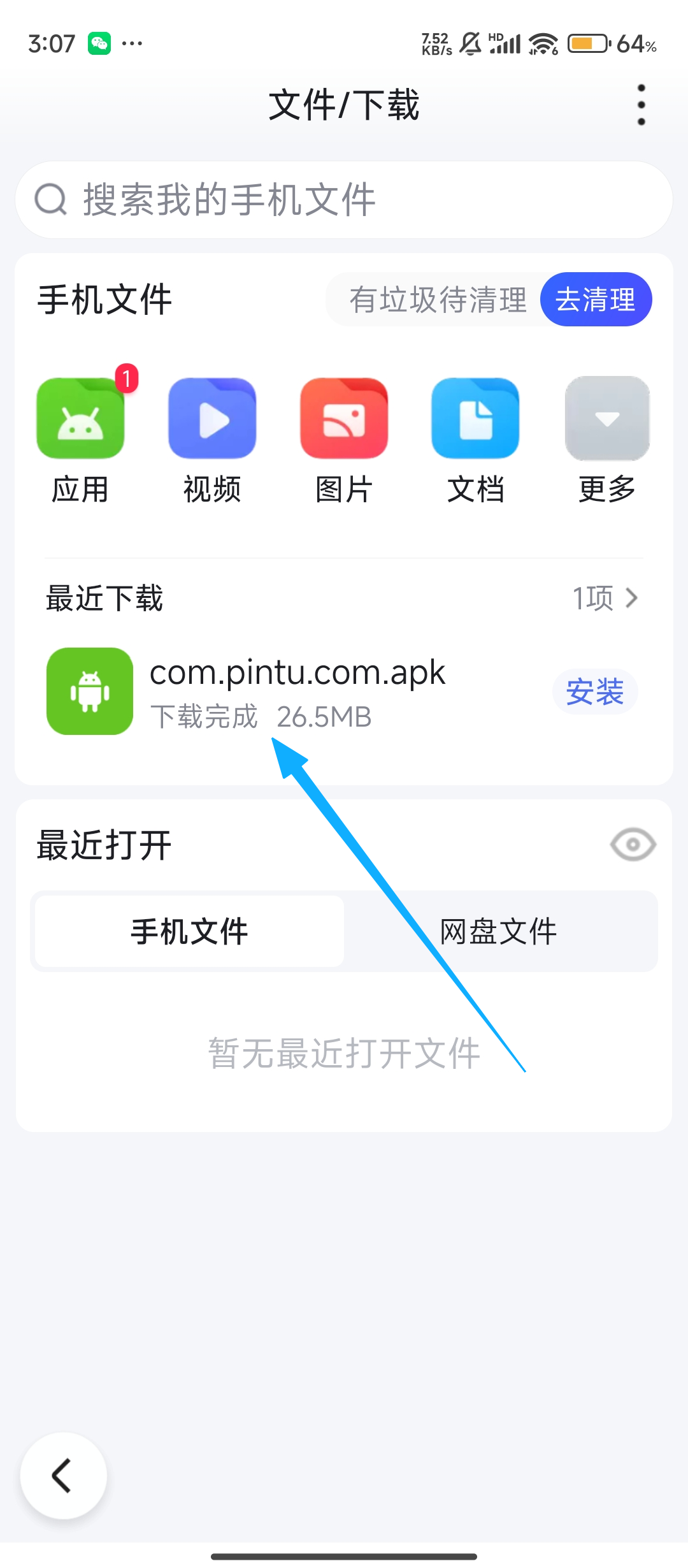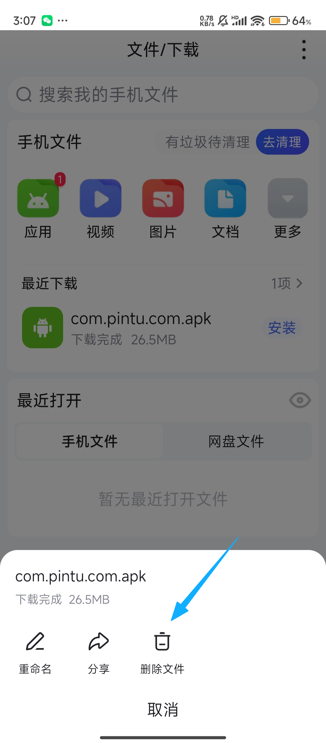 2、在文件或下载页面,找到要删除的下载文件,长按该文件。