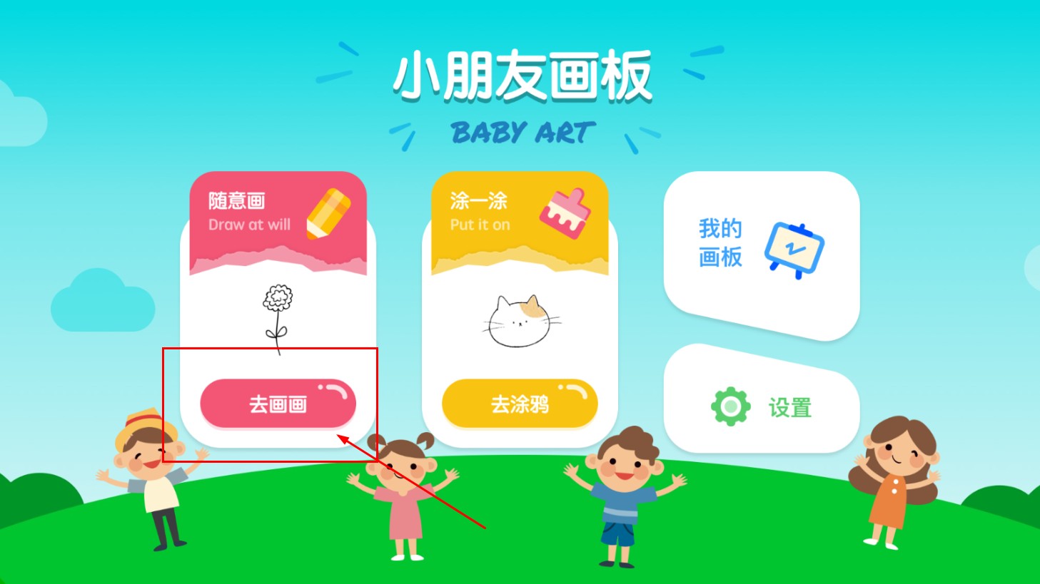 1、选择【随意画】-【去画画】按钮,进入自由绘画界面,开启宝宝的创意绘画之旅。