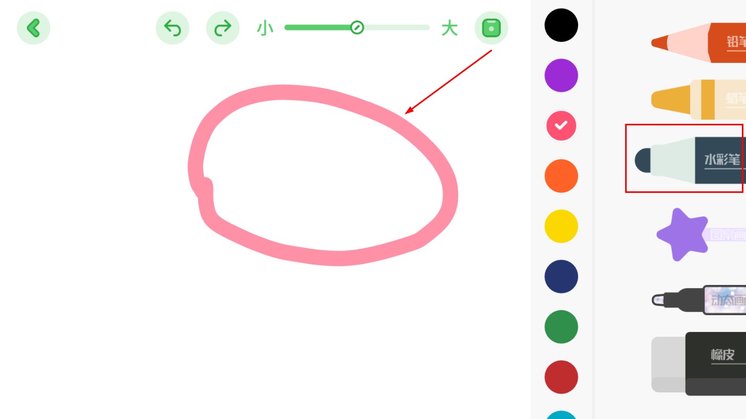 2、在绘画界面选右侧的【水彩笔】工具,搭配色彩栏的颜色,绘制想要的图案线条。