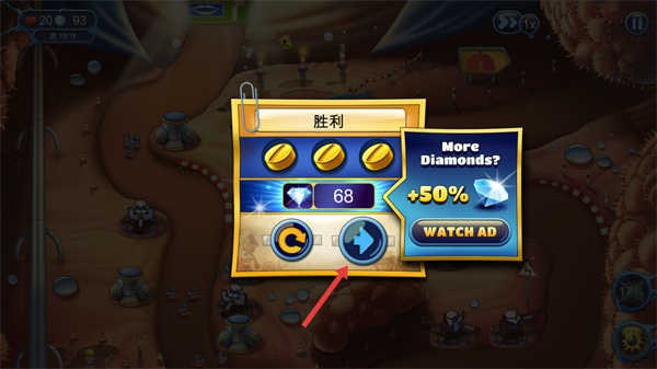 4、关卡胜利后获得【68钻石】等奖励,点击箭头按钮进入下一个新手关卡继续学习防御策略。