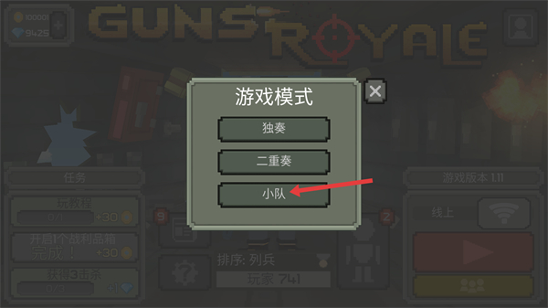 1、在【游戏模式】界面选择【小队】模式开启对局。