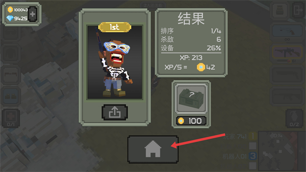 4、获胜后查看【结果】界面,获取【1st】排名与【XP:-213】等奖励,点击【家】按钮返回主界面。