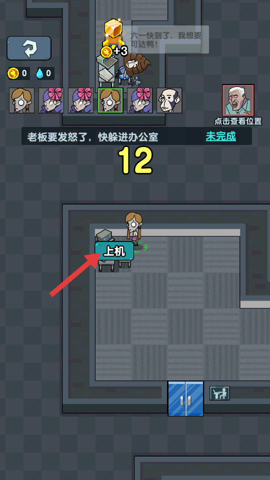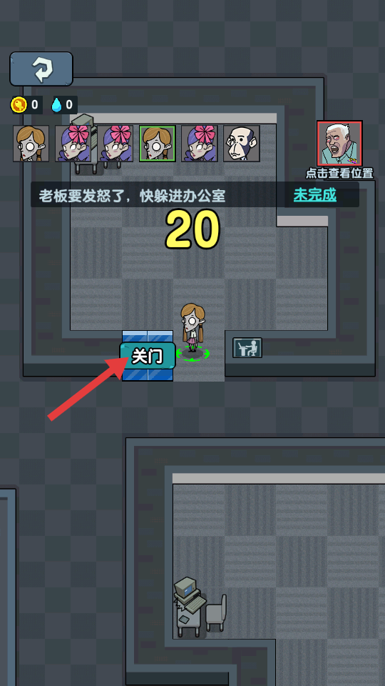 3、进入办公室后点击【关门】,躲避老板,完成任务步骤。