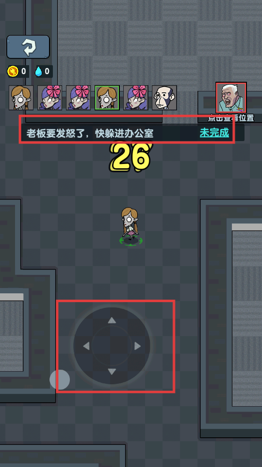 2、使用移动摇杆控制角色移动,根据提示,向办公室方向移动。