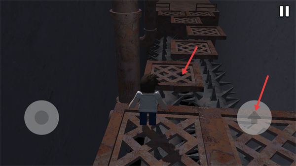 4、在带刺的平台上,按箭头提示操控角色跳跃前进。