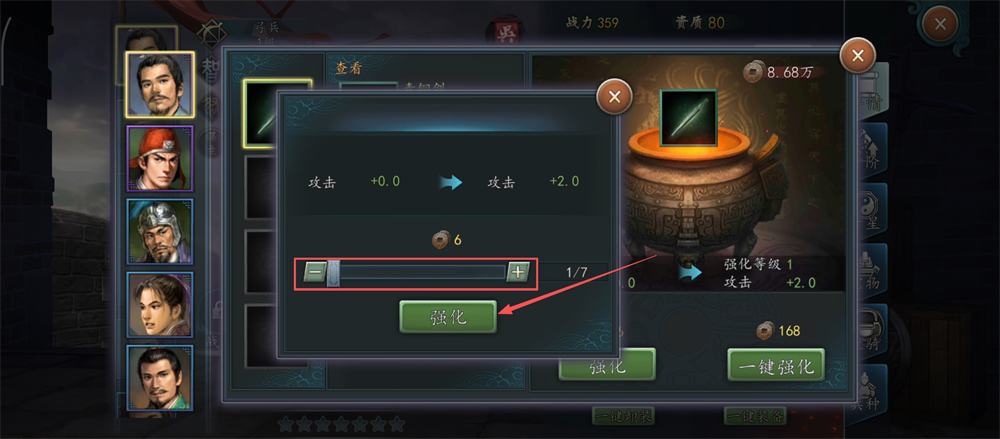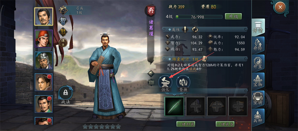 1、在诸葛瑾界面点击【强化】,开启装备强化流程,为提升武将战力奠定基础。