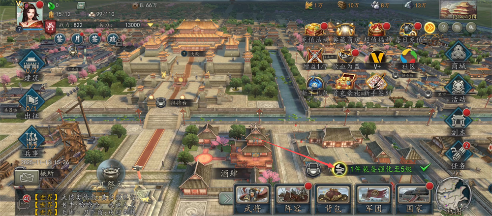 4、返回主城界面,点击领取装备强化奖励,获取资源以支撑后续武将培养与装备养成进程。