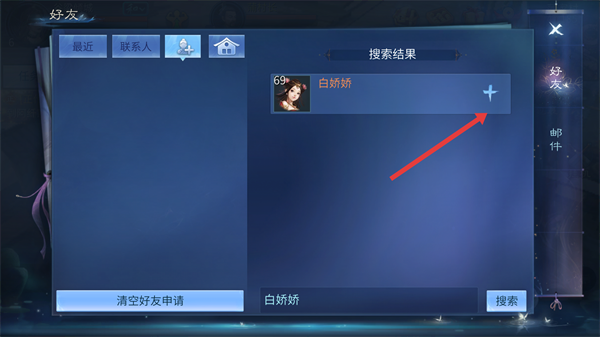 4、搜索到目标玩家后,点击其旁加号按钮,发送好友申请。