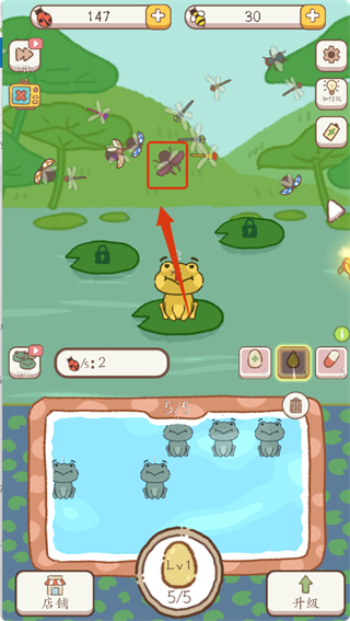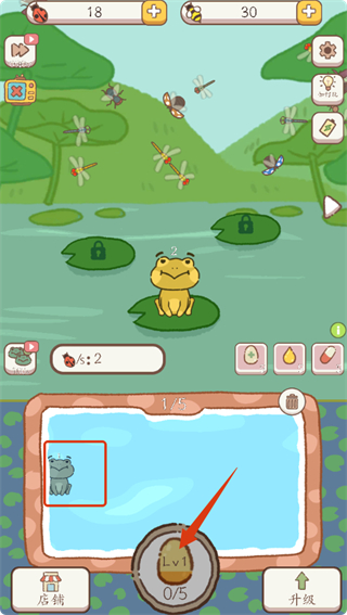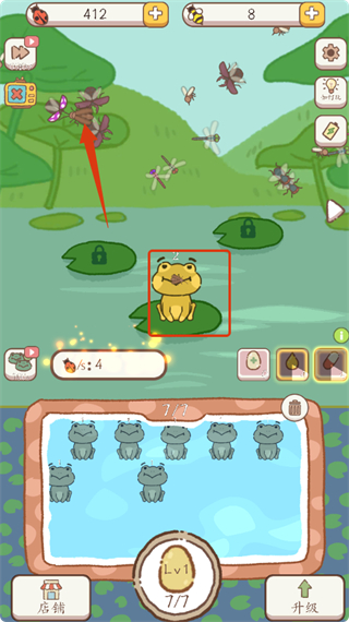 1、点击【Lv1】蛋,孵化小青蛙,积累青蛙数量,同时观察上方昆虫,为后续捕捉做准备。
