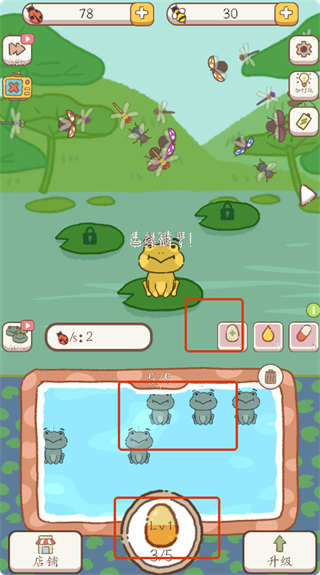 2、不断孵化青蛙,填满池塘,注意蛋的孵化进度,提升青蛙数量以增加捕捉昆虫的效率。