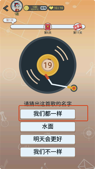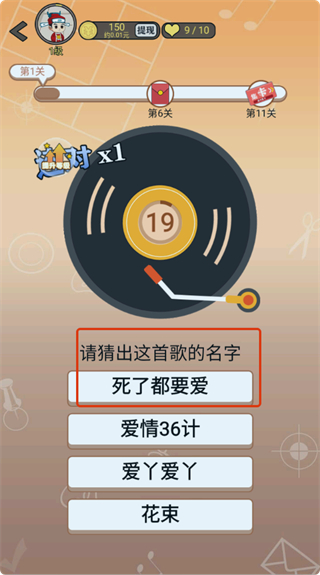 1、在游戏主界面,点击【疯狂猜歌】选项,进入第1关开始猜歌挑战。