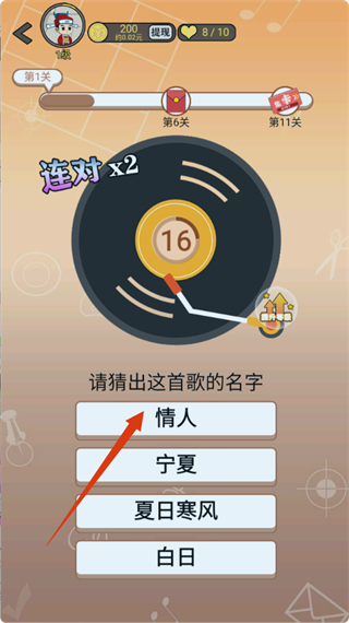 4、保持节奏,选择正确歌名“情人”,争取连对次数,获取更多奖励。