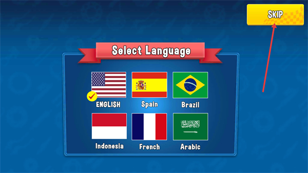 1、在语言选择界面,选择语言(如English),点击【SKIP】跳过设置,进入游戏。