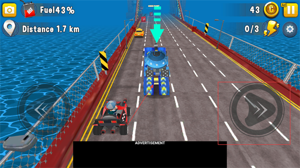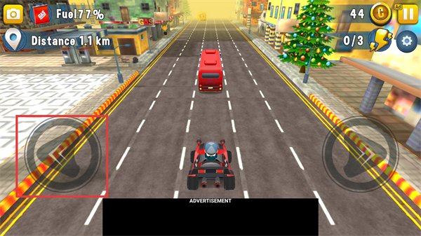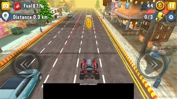 3、利用左右方向按钮控制赛车行驶方向,避开障碍物和其他车辆,确保赛车能持续行驶,积累金币和行驶距离。
