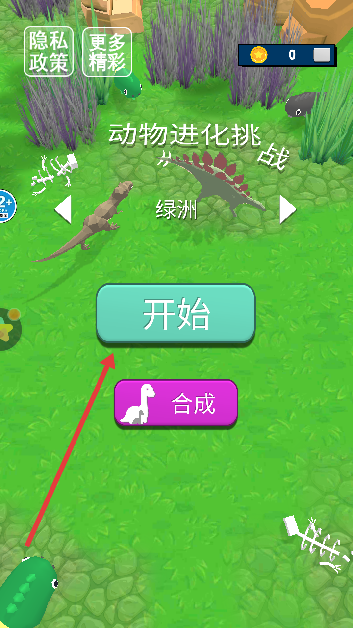 1、点击开始按钮,进入动物进化挑战的绿洲场景,控制恐龙角色开始游戏。