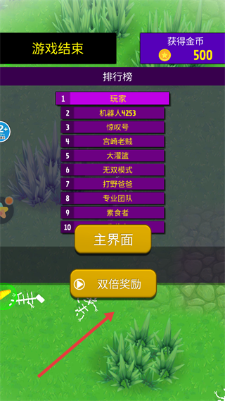 4、游戏结束后,可选择双倍奖励观看广告获取更多金币,或点击主界面返回,积累资源以提升恐龙实力,挑战更高排名。