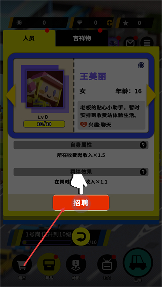 2、点击【招聘】按钮招募员工王美丽,她能使所在收费岗收入×1.5,还有羁绊效果提升收入,助力收费站收益增长。