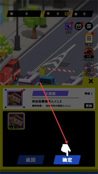 4、确定招募员工王美丽后,点击【确定】按钮,让她入职1号收费岗,利用其收入加成属性,提升收费站收益。