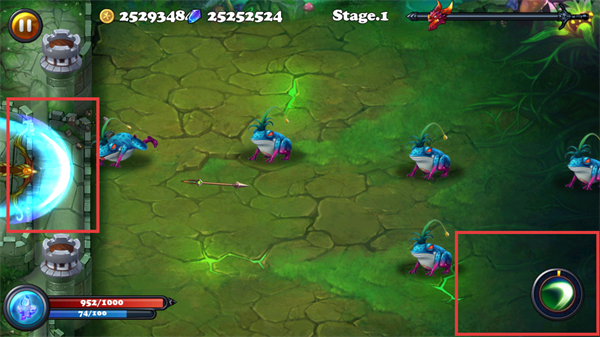3、战斗中防御塔释放技能(左侧蓝色特效)攻击敌方群体怪物,需通过右侧技能按钮辅助输出,提升清怪效率。