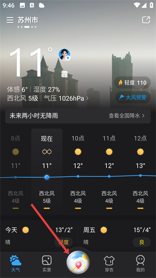 1、打开天气通App,我们点击底部的定位标识按钮,进入对应界面吧。
