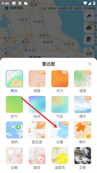 3、在【雷达图】界面里,我们选择【云量】选项,查看其相关信息哦。
