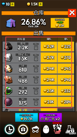 1、仓库中需精细化管理各类矿石资源,根据市场需求和资源存储上限,选择部分或全部出售,最大化获取金币收益。