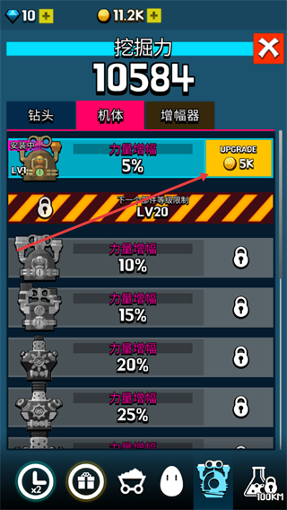3、升级机体(如花费5K金币提升力量增幅至5%),从设备层面增强挖掘力,全方位提升矿石开采速度和产量。
