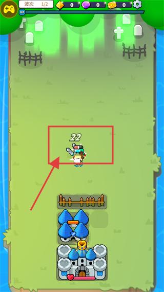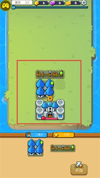 2、战斗前布置【蓝色建筑】和带植物的【栅栏】在城堡上方区域,合理布局后准备迎战第二波敌人。