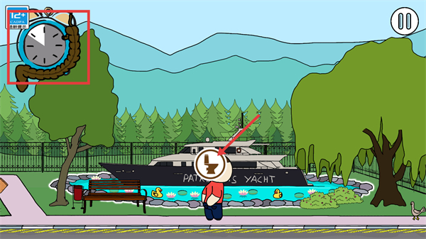 2、留意左上角时钟元素,在游艇场景响应向下提示,与场景元素互动,解锁解谜线索。