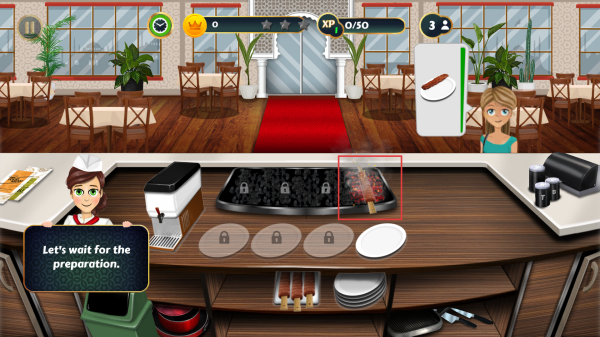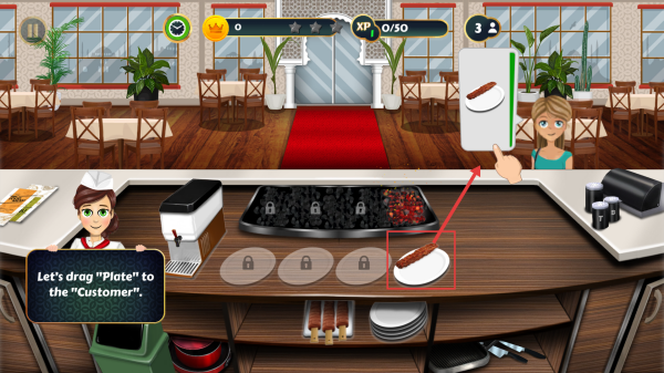 3、将餐盘拖至顾客处,完成菜品送达,推进烤肉店的经营流程。